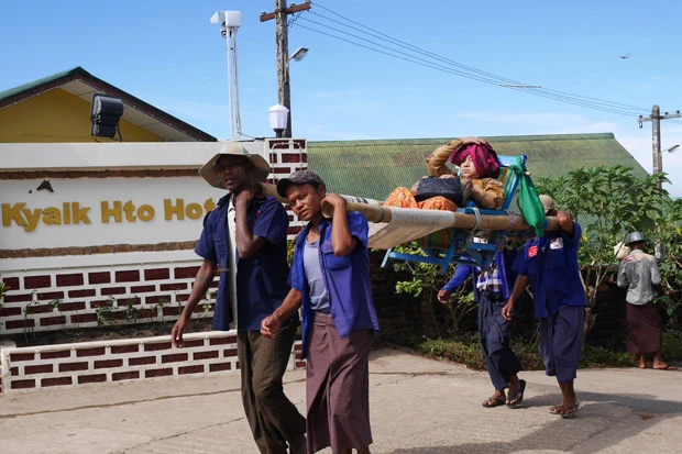 【This week’s BLUE】チャイティーヨーの敷地内では人力カゴで移動もできる。運ぶ人たちは炎天下、汗かいて大変そ~!