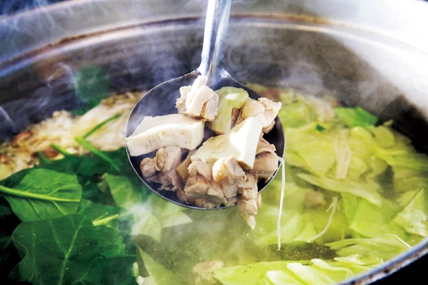 親方の大好物、豚足がメインのちゃんこは、とにかく「煮込む」のがポイント。前日に2時間、夜が明けて早朝からまた2時間。しっかりとダシが出た豚足は、箸でつかむと肉と骨が簡単に分かれる! 1杯目はそのまま、2杯目はポン酢を加えて味に変化をつける。