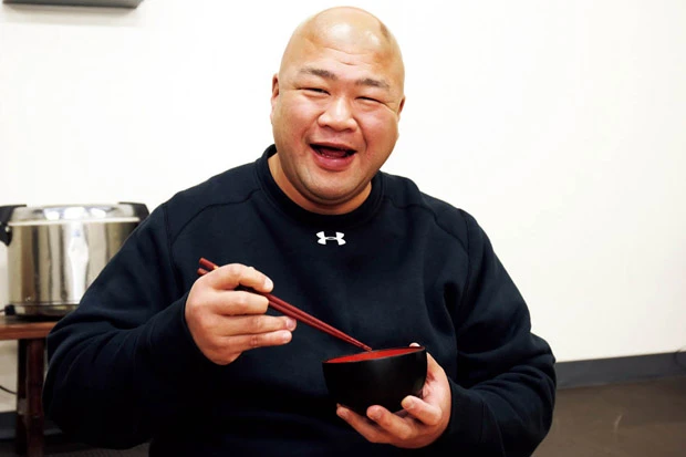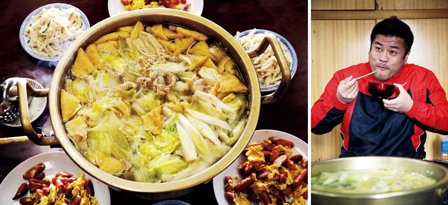 相撲は体で覚え、味は舌で覚える─その始まりは定かではないが、100年以上にわたって兄弟子から弟弟子へ、脈々と受け継がれてきた春日山部屋の伝統の味。野菜たっぷりで栄養バランスもよく、優しい味の塩炊きちゃんこは、暑くても寒くてもいくらでも食べられる!(画像左)春日山親方(元幕内・濵錦)は自称グルメ。弟子が作るちゃんこの味にも厳しい……!?(画像右)