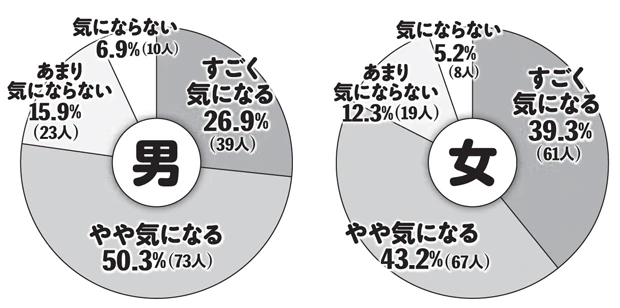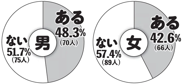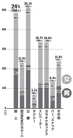 最初の質問で、まずは路上以外の公園など公共の場も含めて経験が「ある」と答えたのは男性855人の約45%、女性1185人の約48%。男女とも半数近くで男女差はほとんどない。
