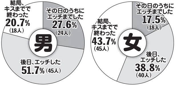 毎回とは限らないだろうが「最初が路チュー」男性87人のうち約79%(当日は27.6%)、女性103人のうち約56%(同17。5%)が「その後エッチまで」と高確率。その割合に男女差があるのも興味深いが…。