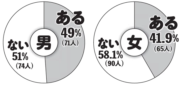 Q1初デートの相手と「路チュー」したことは?(%は男145人、女155人の中での割合、以下同)