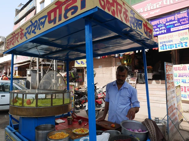【This week’s BLUE】気になる屋台飯。こちらはポハと呼ばれるライスフレーク。刻んだ野菜とスナックをのせて召し上がれ。味はというと、これがオイシイんです。言うならば、タコライスって感じのインドの軽食