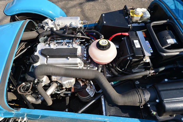 軽タハムのアイデアは、そもそもケータハムの日本代理店の「エンジンとボディをちょっと変えれば、軽になるじゃん!」という思いつきによるもので、エンジンから変速機、そしてリアアクスル…までが日本のスズキ製(大ざっぱにいうと、ジムニー2WDと同じもの)。日本で生産された心臓部が英国まで海を渡って、軽タハムとなって日本に戻ってくる…という、世界を股にかけたゴージャス生産。