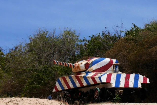 役目を終え、サビついてしまった戦車。その哀愁漂う姿が水着ギャルにモテモテ。戦争に出向くより今の生活のほうがお気に入りのようだ