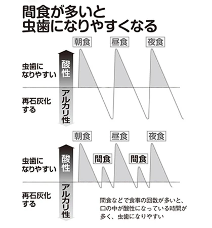 はい。それで、朝・昼・晩と食事をすると、これが3回繰り返される。しかし、間食をしたり、砂糖入り飲料を飲み続けていると口の中が長時間酸性になり、再石灰化が起こらず虫歯が進行するんです。