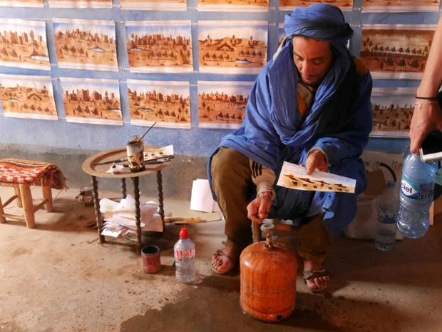 【This week’s BLUE】アイトベンハッドゥで見た、あぶり出しの作成現場。上手に濃淡をつけてモロッコの景色を描き上げていく。