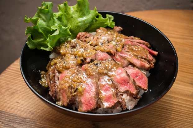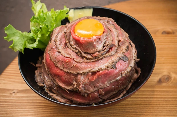 ◆the 肉丼の店並・大・メガ盛りの肉丼が食べられるお店。「レアローストビーフ丼」は、仕込みに3日間かかるそう。お肉がめちゃくちゃ柔らかくてジューシー! とろ~っとつぶした黄身と、コチュジャン醤油の自家製ダレがごはんにピッタリです。ごはんが残ったら、追加で人気メニューの「南国風牛すじカレー」をかけるのがオススメの食べ方!