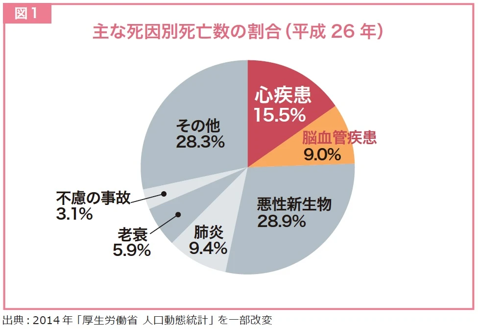 生活習慣の乱れやストレスから、動脈硬化が引き起こされ、心臓や脳へ影響していく。日本人の死因の4分の1は血管が関係していると言える。出典:2014年「厚生労働省 人口動態統計」 「カルピス」由来健康情報室にて一部改変