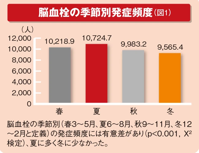 ここでは脳血栓を例に取るが、夏は汗を多量にかくので塩分・水分が失われ、血液がドロドロになってしまうため血管事故のリスクが高まる。出典:瀧澤俊也.脳卒中データバンク2015より 「カルピス」由来健康情報室にて一部改変