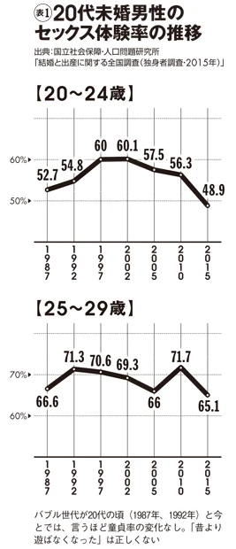 「はい。さらに、『全然遊ばなくなった』ともよくいわれますが、そもそも、草食男子が上の世代と比べてセックスをしていないという認識は間違っています。バブル世代が20代だった頃の未婚男性の童貞率と、草食世代が20代だった頃の童貞率はそれほど変わりません。