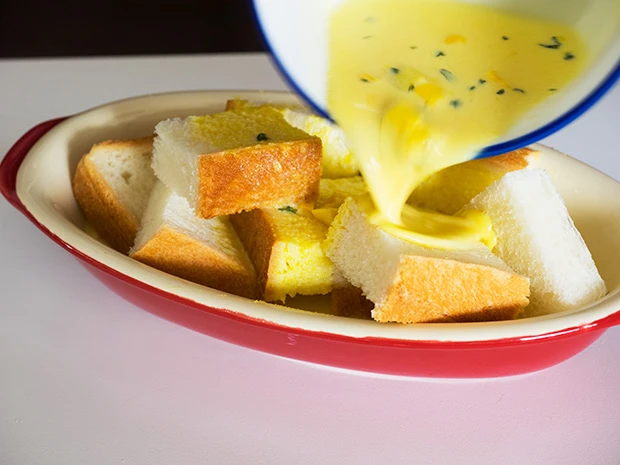 パンをひと口大くらいに切ってグラタン皿に乗せたら、かぼちゃスープを上からかけるだけ。おうちにある材料で作るから、お店で食べる味とはちょっと違うと思うけど…。