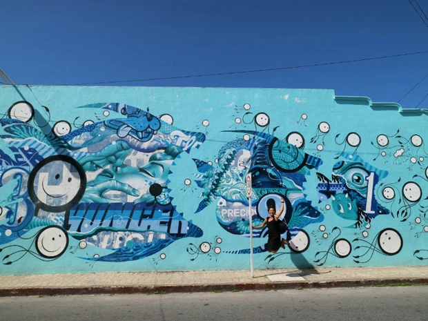 【This week’s BLUE】コスメル島の街中の青い落書き前でジャーンプ!
