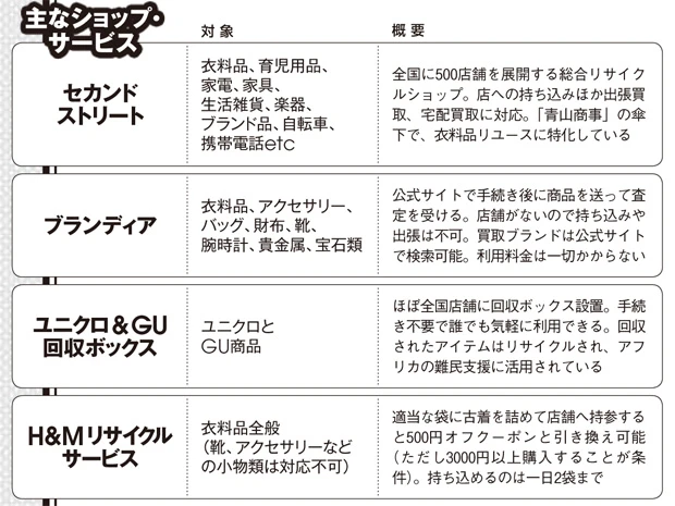 この流れで考えると一番オススメなのはまず『ブランディア』などの買取サービスで査定し、値段がつくモノは売る。値段がつかないモノはユニクロ系かH&Mで回収してもらい、リサイクルに役立てる。これがオトク度も社会貢献という面でもよさそうだ。