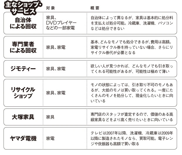 スタンダードな処分法は、粗大ゴミとして自治体に回収してもらう方法。しかし、あらかじめ予約して引き取り日を決めるなどの手間がかかる。さらに、家電リサイクル法などの法律があるため、テレビ、冷蔵庫、洗濯機、パソコンなどは回収してもらえない。