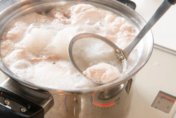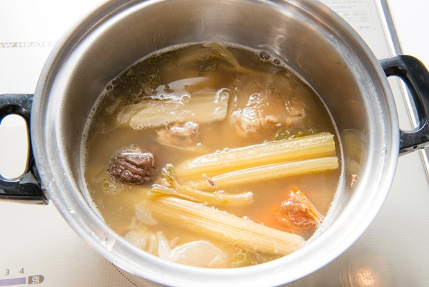 (4)(3)の鍋に(A)を入れてふたをして4~6時間煮込む。後半の3時間でアミノ酸類がスープに溶け出すため、ぜひ時間通りに煮込んでもらいたい。煮込むのは1日に2~3時間、2日間に渡ってもいい(5)材料を取り除き、茶こしなど網を使い別鍋に濾せばできあがり。使わない分は製氷皿に入れて冷凍するなどすれば保存できる