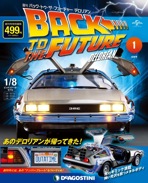 『週刊 バック・トゥ・ザ・フューチャーデロリアン』デアゴスティーニ/創刊号499円(税込) ※2号以降は1790円(税込)全長52.7cm、全幅23.2cmの1/8スケールで再現されたデロリアンが登場。ボディはアルミ、シャシーなどにはダイキャスト合金を採用し、重量は約8.4kg!! 全130号で、お届けです!