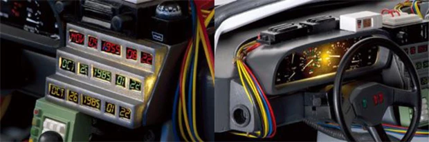 ★車内のデザインも映画そのまま! 【左】ビッグスケールだけに車内の再現度もはんぱない。タイムリープの日時を設定する「タイムサーキット」は発光タイプですよ! 【右】ダッシュボードは通常のパネル以外に、タイムリープに必須の速度88マイルを計測する専用のデジタルメーターも装備している。
