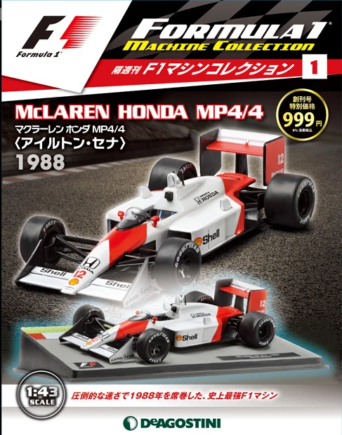 『隔週刊 F1マシンコレクション』デアゴスティーニ/創刊号999円(税込) ※2号以降は2490円(税込)1950年から開催されたF1に出場したマシンを、ミニカーの標準的なサイズである1/43スケールでモデルアップ。もちろん冊子には、マシンのトリビアが満載ですよ! 創刊号に付属するマクラーレンホンダMP4/4。1988年にアイルトン・セナが乗車し、年間王者を獲得した。