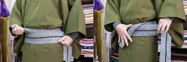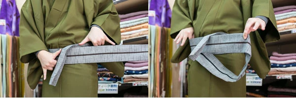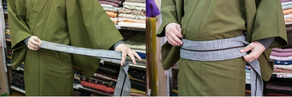 【男帯の締め方(片ばさみ)】(1)帯の上下30cmほどを半分に折り帯を巻く