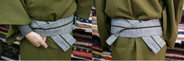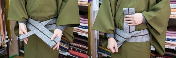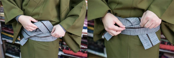 (6)帯を下側から両手で持ち、腰に結び目が来るよう左方向に半周回せば完成