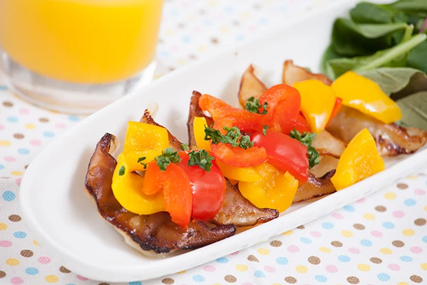 ■恋愛レシピ27 餃子マリネ材料(1人前)冷凍餃子…5個●パプリカのマリネ(作りやすい分量)パプリカ…1個分すし酢…大さじ3杯あれば飾り用としてパセリ、ベビーリーフ
