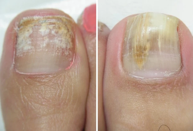 爪水虫の症状。厚くなった爪(左)とボロボロの爪