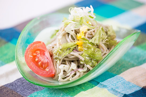 1.ボウルにざるそばを入れて軽くほぐす。2.(1)にバジルソースを加えて和え、さらにサラダを加えて混ぜ合わせる。