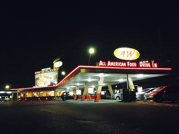 A&W(牧港[まきみなと]店)日本では沖縄のみに絞って30店舗展開するアメリカ生まれのチェーン。県民からは「エンダー」の愛称で親しまれる。