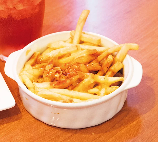 ポテトの上にソースとチーズをかけた「プーティーン」。グレイビーソースと明太ソース、オマールマヨソースの3種類から選ぶことができる。