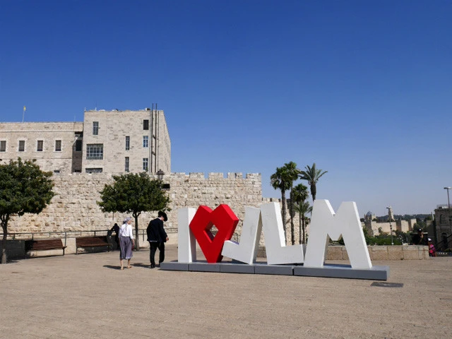 ユダヤ教徒のカップルとアイラブエルサレムのオブジェ。