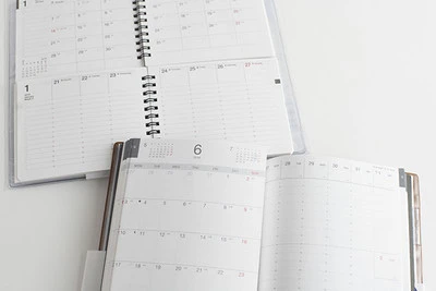 「ノートの合間に、月間ブロックのフォーマットを挟み込むことでカスタマイズできるダイアリーです。めくる手間なくスケジュールを確認出来て、ノートに割り当てるページ数を自由にコントロールできるのが最大のポイントですね」