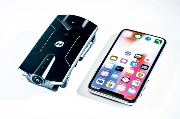 プロペラを収納すると、iPhone XSサイズに! 本体ほかバッテリー2個、専用コントローラーも付属。