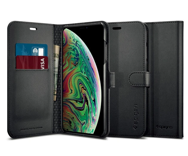落ち着いたデザインで、カードやお札の収納もOK。手帳型はiPhoneを横置きしたときにスタンドとなり、動画視聴が超快適!