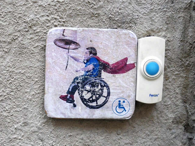 マゾカフェの車椅子用の呼び鈴が、マゾとは全く関係ないラブリーなイラスト。
