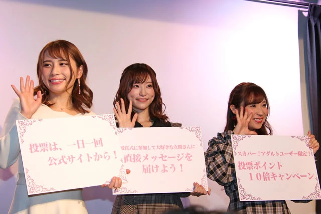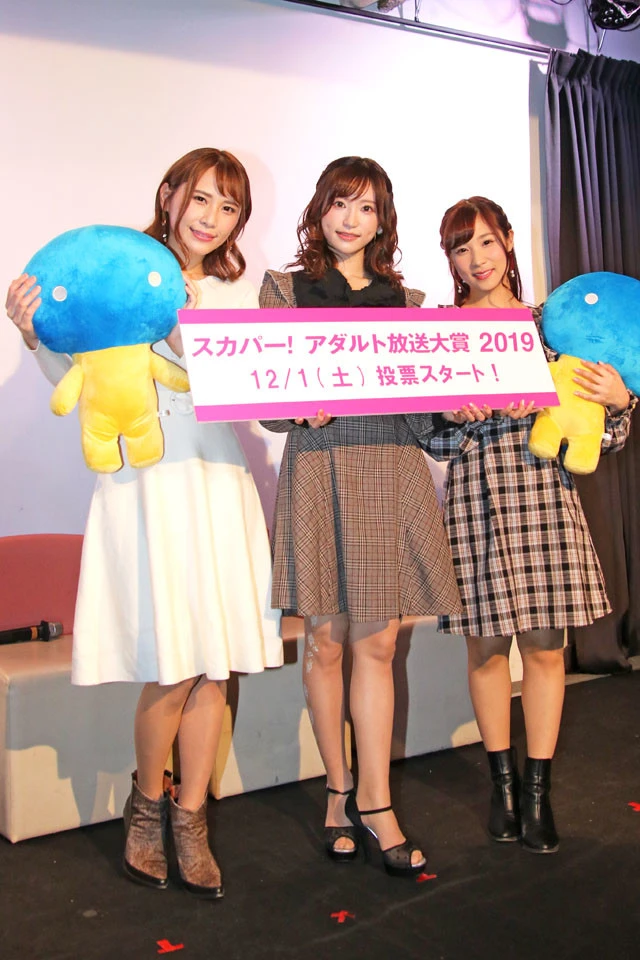 『スカパー!アダルト放送大賞2019』のノミネート女優発表イベントが27日、都内で開催され、昨年の受賞者で「スカパー!アダルトアーン❤バサダー2018」を務める天使もえ、栄川乃亜、花咲いあんが登壇した。