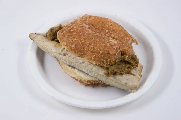 カレーパン+さば。レモン果汁やコショウなどがきいたマリネ風のさばとカレーパンのハーモニーは絶妙