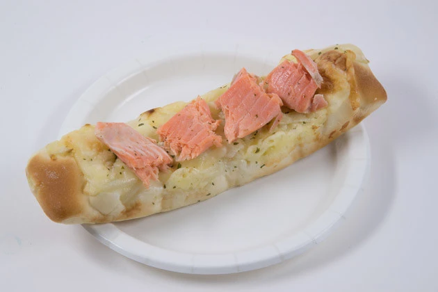 チーズオニオンパンにサーモントラウトを適当な大きさにちぎってのせると、ピザのトッピング感覚で楽しめます。