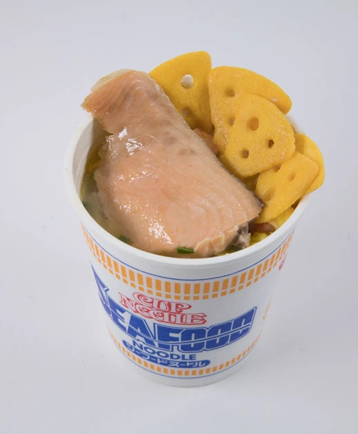 シーフードヌードル&チーズスナック菓子+サラダサーモン。スープにチーズの香りが広がり、そこにサーモンをプラスすると、三位一体、新感覚の味が完成!