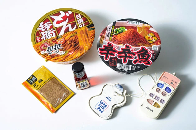 (5)低周波! 味覚以外からもシビれをトッピングするため、低周波治療器を顔に装着し電気を流しながら食べる! しかしこれはあまりにも危険なことが判明。絶対まねしてはいけない!