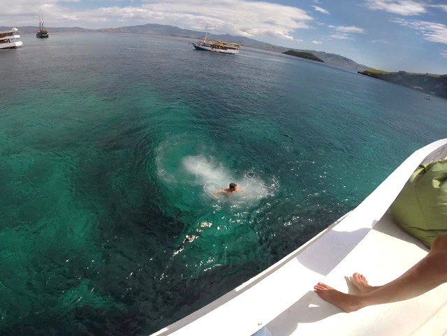 船の高いところからダイブ! 海の透明度高ーい!