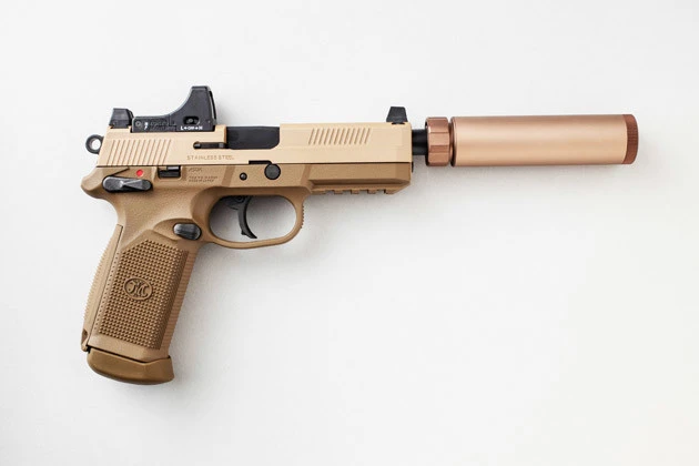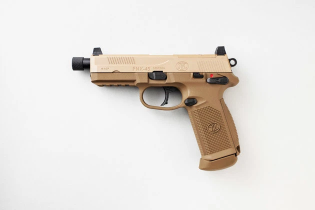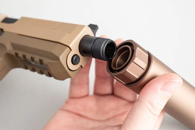 本体塗装は近年の特殊部隊拳銃の定番カラーとなっているカーキ系のFDEカラー。ボルトオンで本体にドットサイト、サイレンサー(消音器)、フラッシュライトを装着できるのも特徴だ。