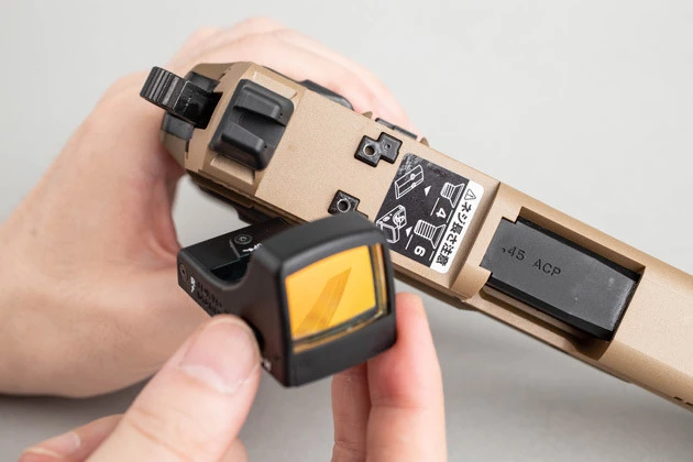 スライド部分に「マイクロプロサイト」(別売り。6800円+税)をボルトオンで装着可能。サイト装着時でもブローバック速度が落ちることはなく、安定した射撃が行なえる。