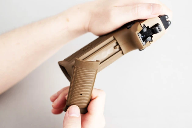 グリップ部分のサイズや握り心地を、「グリップバックストラップ」の差し替えによって調整できるシステムを実銃どおりに再現している。