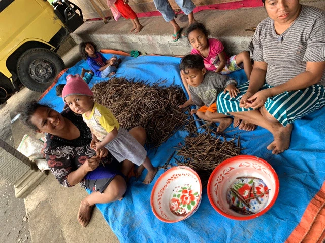 ヨハンの村で青いビニールシートの上で作業する人たち。女性と子供ばっかり。