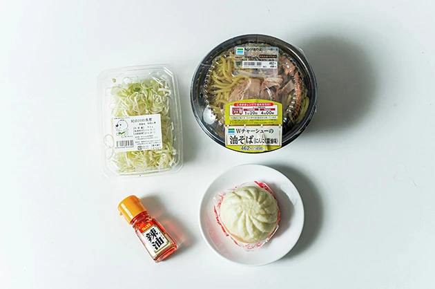 ・ファミリーマート Wチャーシューの油そば(ニンニク醤油)1個 ・肉まん 1個 ・刻みネギ 1パック ・ラー油