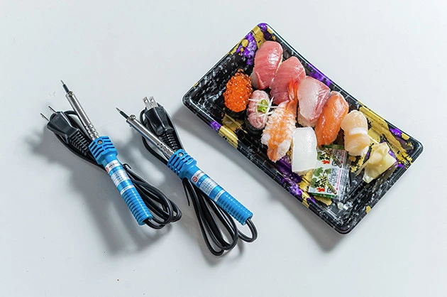野島 ちなみにハンダゴテ2本を箸のように使えば、すしを炙りながら食べることもできます。やけど寸前のスリルもまた調味料になりますよ。