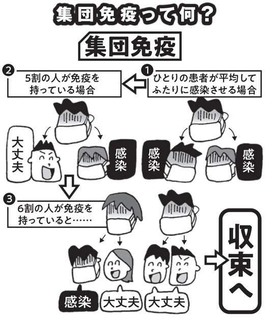 わかりやすく言うと、50%の人が抗体を持っていれば、ひとりの感染者がふたりにうつしたとしても、ひとりは抗体を持っているので発症しません。そして、その感染したひとりが、またふたりにうつしてもひとりにしか感染しません。これだと感染拡大はしません。それが60%になると、ひとり以下になるので感染者がどんどん減っていくという考え方です。
