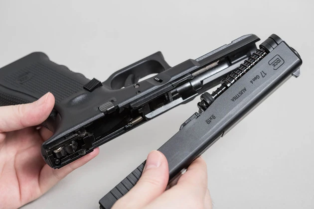 実銃と同じアクションでスライドとフレームを分解可能。射撃ナシでもこういったアクションで楽しめるのがガスブロの魅力!