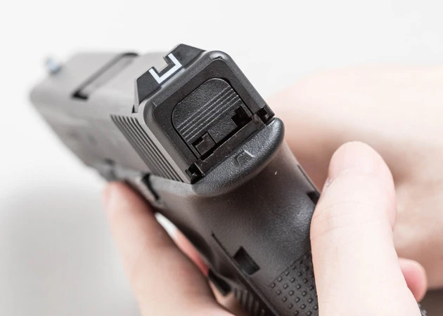 リア、フロントサイト共にホワイトに塗装。別売りの「グロックシリーズ用マイクロプロサイトマウント」(1580円+税)を使用すれば光学サイトの搭載も可能。